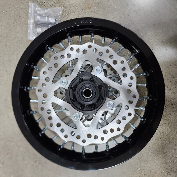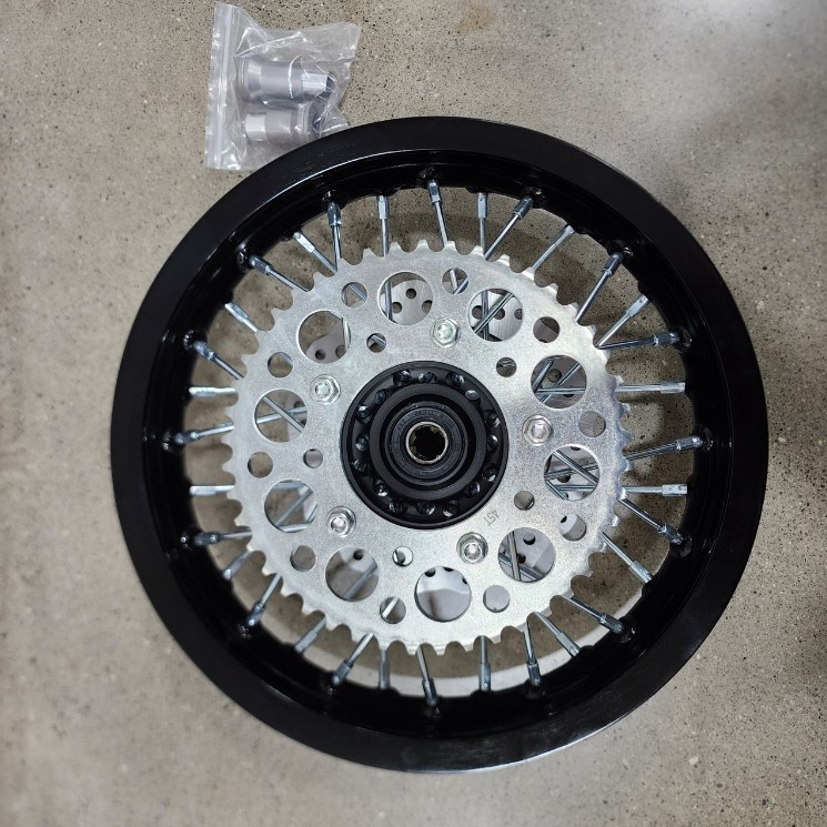1.85 x 12" complete replacement aluminum rear wheel for Piranha/YCF 140 and 190 models. Comes with brake disc, spacers, and 45T sprocket as shown. CNC black hub with black rim.