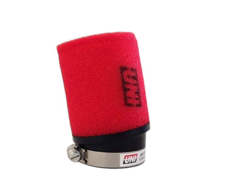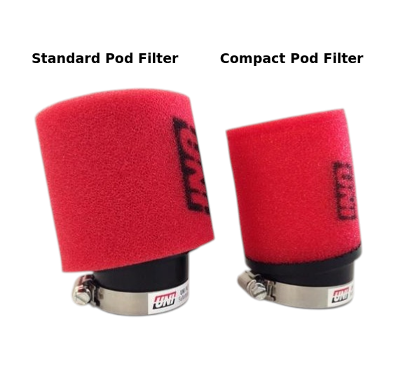 Uni 2 stage air filter in a new compact size. Stage one and two are bonded together and molded into the intake boot. This allows for a compact 3 inch by 3.5 inch filter with a 17 degree bend. This new filter tucks away better and theres less chance of burning or tearing off. Be sure to check out the new special Outerwears cover made specifically for this filter for added protection and water repellency.